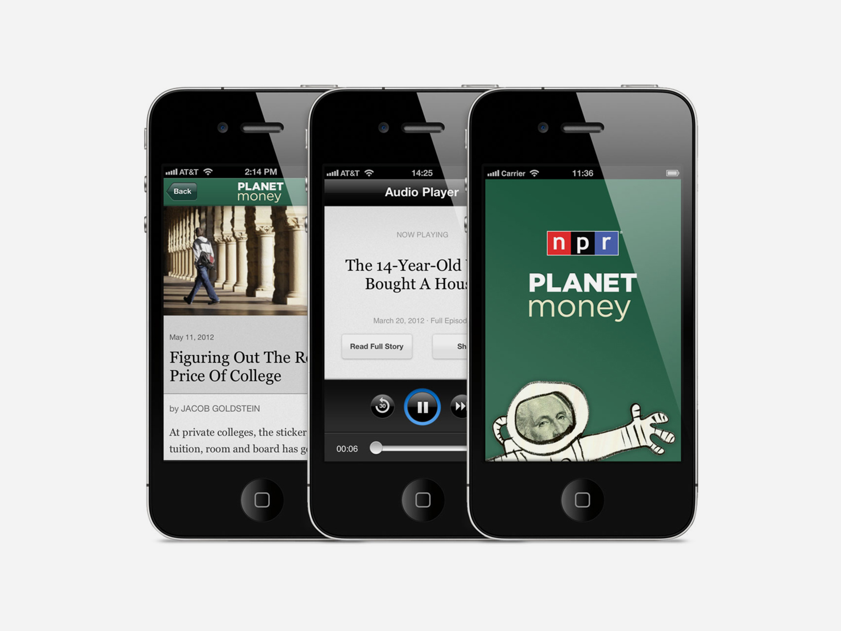 Planet Money is heard far more than it is seen. We needed a visual design that was consistent with the suite of NPR products but also allowed the personality of the program to shine. Mo Willem's playful character 'Bill' was perfectly suited as an ocassional wingman to help users navigate the content. Typography and button styles are interpretations of existing patterns that were translated specifically for this application.