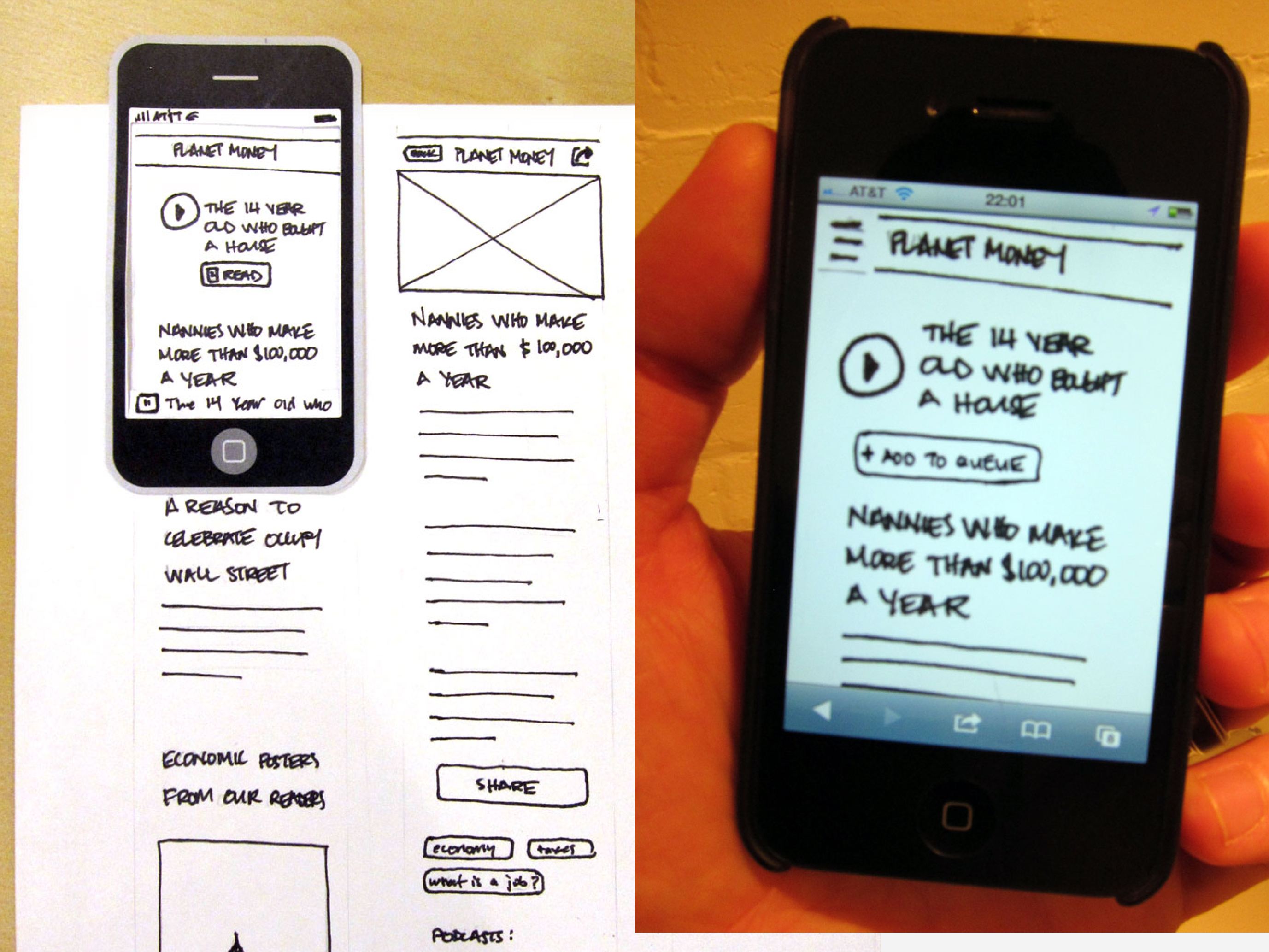 After some initial brainstorming, we focused on some sketches that allowed for an audio-first experience but supplemented the experience with text. We turned these initial sketches into a set of paper prototypes for some hallway usability testing and to gain stakeholder approval.